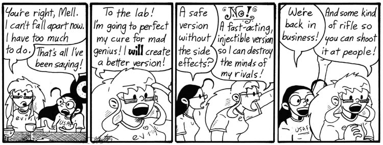 The other good thing about doing this week of strips is that I was able to end it with Helen and Mell rededicating themselves to evil. They needed to get pumped up for the rapidly-approaching dénouement.