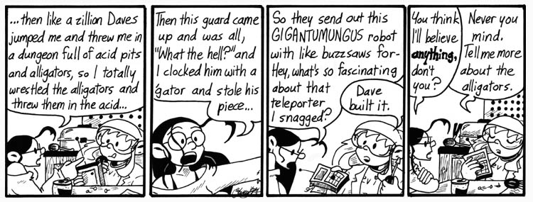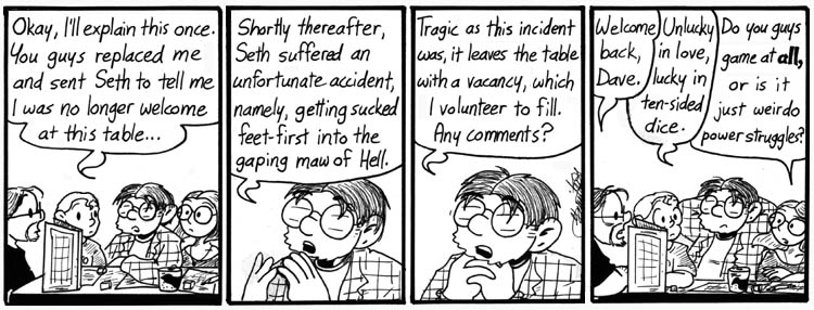 Actually, it was David’s being sent to the moon, followed by being stuck (or, rather, unstuck) in time, causing him to miss 10 weeks of D&D, that got him kicked out of the gaming sessions. giving Iris his spot. It was Seth’s feet-first departure that allowed Dave to return. See January 26 & 27, 2004.