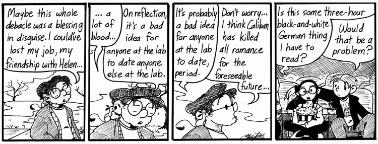 Okay, s’pose maybe I’m wrong, but I’m getting strong feelings that the frame with Mell & Caliban in the movie theater is referencing a certain Daniel Pinkwater Novel. My only hope now is that I cannot be tracked down and killed by the forces which created this comic. Seeing as I gave them my E-Mail by protocol, I suppose that would be nil. Oh well, guess it’s time to hide in my bunker and wait for impending doom.