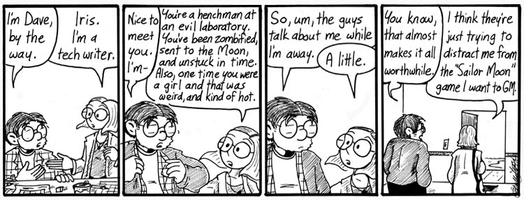 My friend Laura, on whom Iris is based, is a writer and editor for a tech magazine, and at the time I wrote this she was running a Sailor Moon RPG. Somebody in the comments yesterday said that Iris looks kind of like Tip from Skin Horse; this is, of course, mainly because I can only draw a limited variety of facial features, but Laura has commented that she and Tip had the same hairdo for a while.