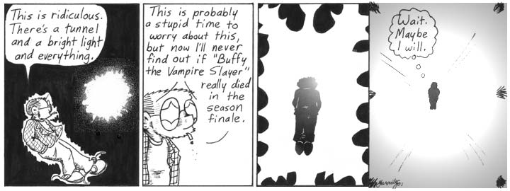 Interesting. I wondered what that last line was supposed to mean. When I read it, I interpreted it as a cliffhanger. I didn’t think Dave would stay dead (this is comics after all), so I kept waiting for the twist that would bring him back. His reappearance over the last couple days strengthened that impression. Then Thursday’s punch line suggests that Dave has learned something between panels 3 and 4. So when I read it, I just figured he had learned what that twist was, and that we the readers would see it soon.