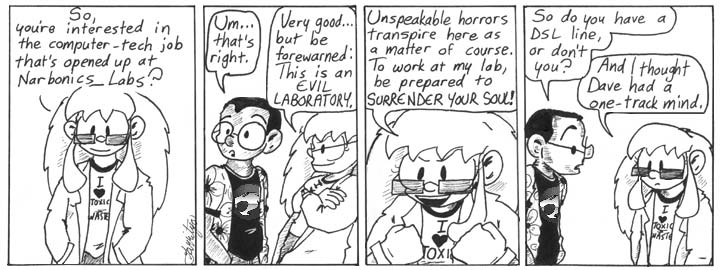 ETA: As folks in the comments have noted, this is the last strip in Volume 1 of the Narbonic print collections (available for sale now!), not counting the bonus story. Kind of weird to end the collection mid-week, but it works.