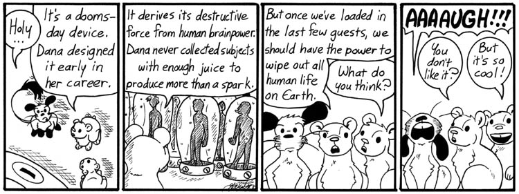 Way back when Dana introduced her idea for the doomsday device, in her first week of strips, it was just an off-the-cuff idea on my part. Not until afterwards did I realize it fit nicely into the climactic story arc. The whole concept of a genius-powered doomsday device went through a lot of permutations. At one point this storyline was set in the Arizona desert for some reason, and Dave’s mind set off the device thanks to a brainpower-enhancing formula Helen had developed. This was before I decided Dave should be a latent mad genius. There were a lot of rough drafts on this thing.