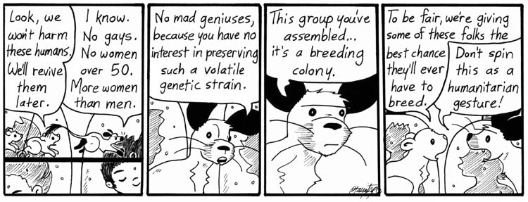 I needed to reiterate that ANTONIO SMITH was among the humans on the island, hence the throwaway lines in the first panel. And yes, Artie is getting a look at a naked ANTONIO SMITH, and it isn’t even fun.