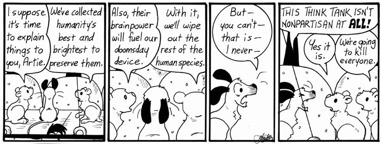 I wrote this one early on, probably right after I had the idea of the flying hamster island. I remember it being in my Big Folder of Notebook-Paper Thumbnails for ages. I never thought it was all that funny, but the dialogue is very, very in-character for Artie, especially the annoyed little aside about not being born. I love writing that guy.