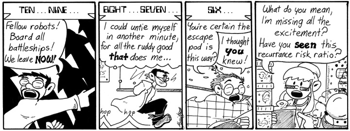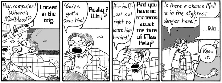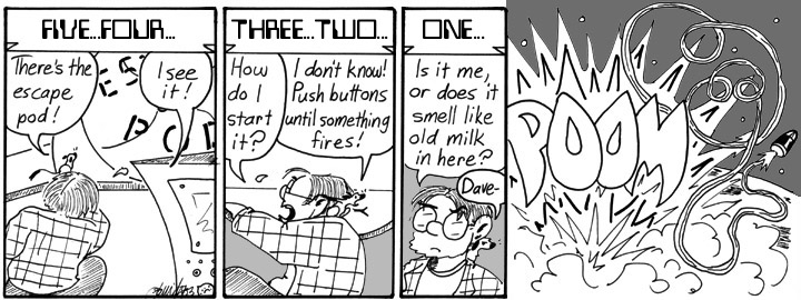 Dave’s line in the third panel is yet another candidate for the coveted Most Obscure Reference in Narbonic title. It’s a veiled reference to John M. Ford’s “Star Trek” novel How Much for Just the Planet?, in which a starship’s escape pod gets filled with milkshake. I’m sorry, that was way too obscure.