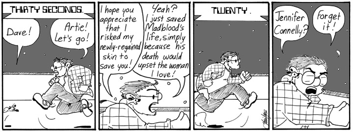 The art in this strip still looks pretty good, especially the first panel. Normally, in a scene like this, you want the character to run from left to right, the same direction the reader’s eye moves, but I had Dave running from right to left to slow down the eye and give the impression that he’s not running very fast.