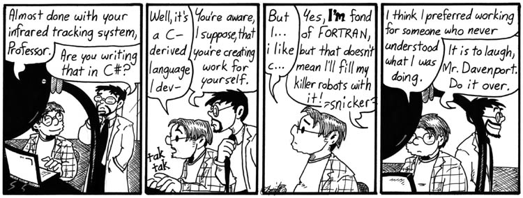 14. @Rex I assume he was going to say “I developed” – as in, Dave made his own C-derived language to code in. Assuming that’s the case, Shaenon’s dialog for this one was spot-on, because that’s exactly what a mad computer scientist would do.