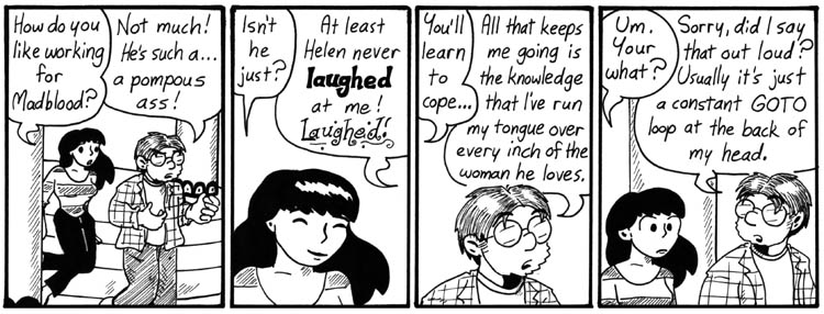 Okay, I admit it: I love this strip. There’s a BASIC joke, Dave mentioning his smoking hot sex life, and, most crucially, Dave’s disturbingly ornate dialogue font in the second panel. With wiggly underlines and everything. You know that’s not going to end well.