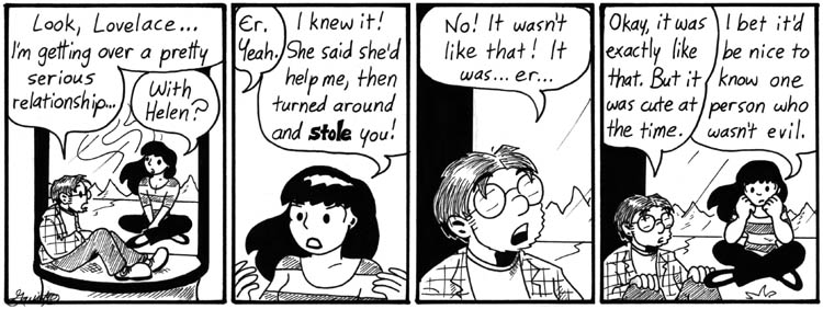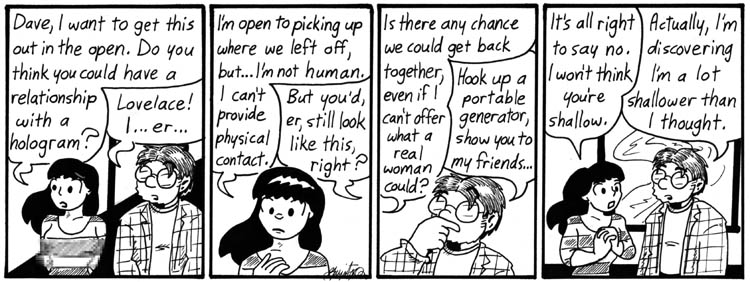 I wrote this one early on, too. In fact, I wrote a lot of the Lovelace-as-hologram strips from this storyline before I wrote the Lovelace-as-computer strips from “Lovelace Affair.” She’s just so much more fun to draw like this.