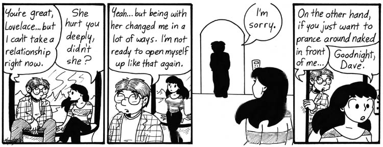 I wrote this one really, really early. Dave had his old hair and a cigarette and everything. I worried about getting the computer terminology right, but I figured that by the time I got around to actually drawing the strip, I’d know all that stuff. I was wrong. I faked it. But it all turned out okay.
