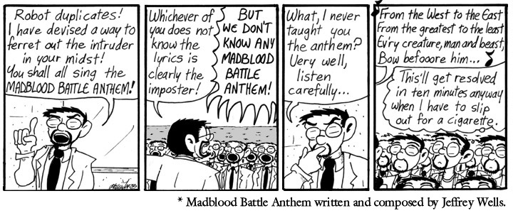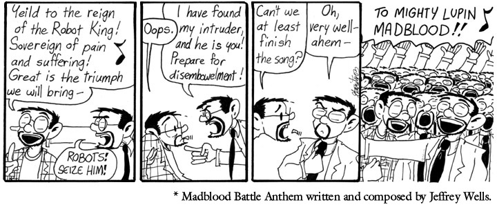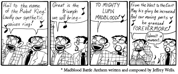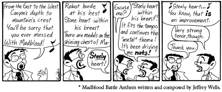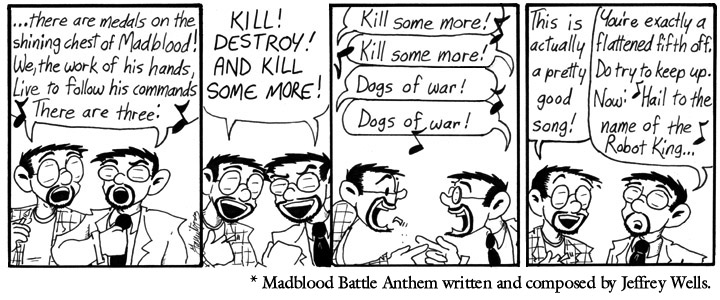 At the time of the Battle Anthem Contest, I’d exchanged emails with Jeffrey Wells on and off. His long-running online story Mundementia One shared certain character and thematic elements with Narbonic (but featured more lemurs), something we found mutually fascinating. I enjoyed Jeffrey’s writing a lot, and then there was this contest, and he sent me a battle anthem which was both brilliant and perfect for my purposes. So here we are.
