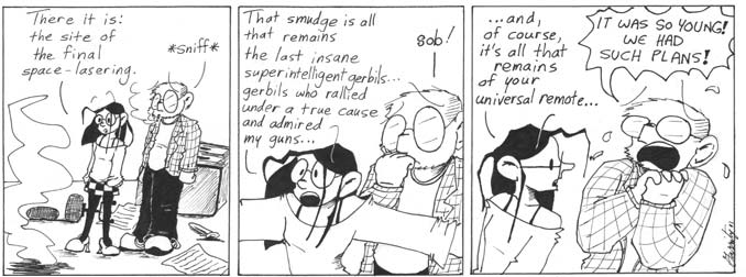 Friday’s Comic: Finally you provide confirmation that it was, in fact, the unnamed gerbil that died here and that it was Jaye who died last Saturday. I mean, really, it’s as if you don’t even realise that allowing your fans to uniquely identify twelve identical minor characters is the greatest responsibility any webcartoonist can bear!