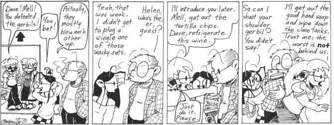 Tuesday’s Comic: Aww, the nigh-imperceptible daily shrinking of the Narbonic strip has suddenly become readily apparant with the significantly populated first panel!