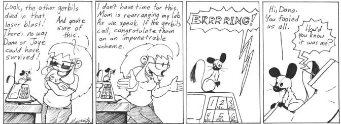 Still tying up loose ends from the “Smart Gerbils” storyline, as we segue into “Dr. Narbon.” I don’t know how so much stuff got overturned in a fight with a bunch of gerbils, but the Narbonics Labs staff has a tendency to overdo things. Also note that this is the exact outfit Mell will wear for the next six years.