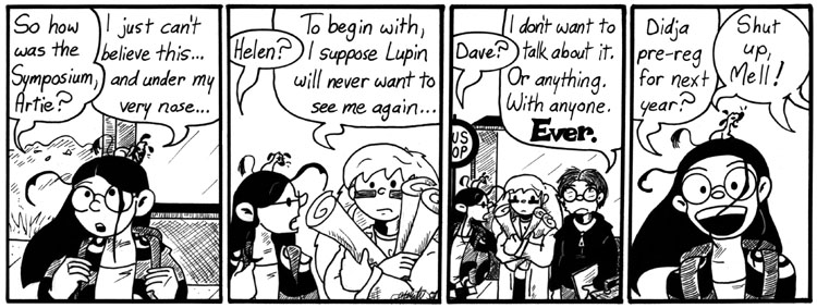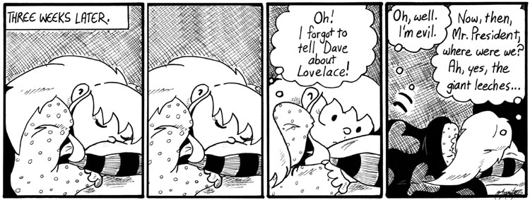 Planning this storyline, I always kind of wanted to do a romantic scene where Helen falls asleep on Dave’s shoulder on the bus ride home, but I’m just not that mushy. Picture it yourself. Bah humbug.