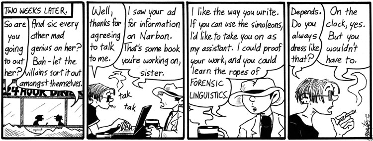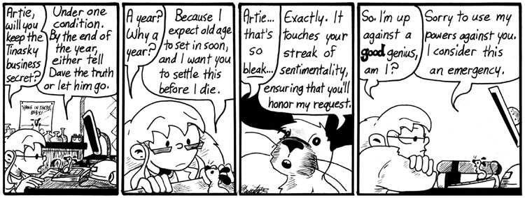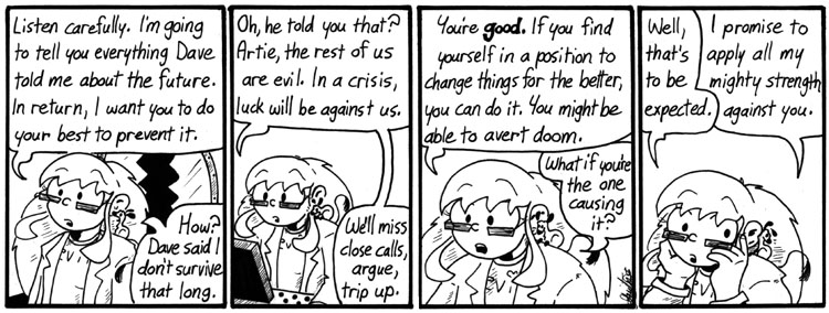 This strip and the previous one have similar punchlines, which always kind of bothered me. I wrote them years apart and they ended up next to each other. But I needed them both, plot-wise, so I kept them in.