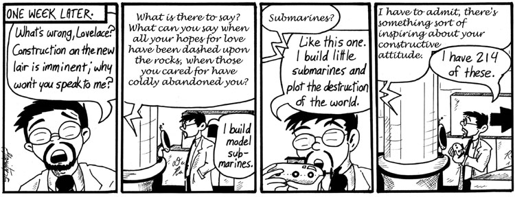This strip was written for my father, a structural engineer who works on nuclear submarines. Later I gave Madblood an actual sub, so I guess he just really likes submarines. Which is understandable. Submarines are cool.