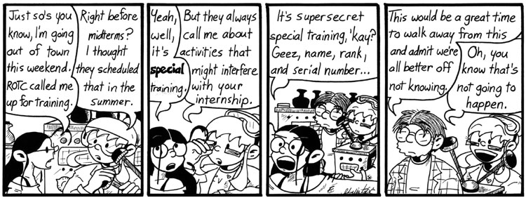 And a new storyline begins! Frankly, I think everything from here to the end of Narbonic is solid stuff. Okay, “Angels” has some weak points, but overall I can read the last year and a half of the strip without cringing. And I love this storyline, because everything awesome happens.