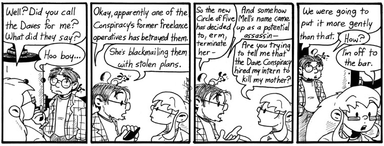 I remember drawing this week of strips at Capricon in Chicago. Dirk Tiede showed me how to draw shine on a character’s hair, like Dave has here. I took his advice and continued to draw Dave’s hair this way for the rest of Narbonic. So thanks, Dirk!