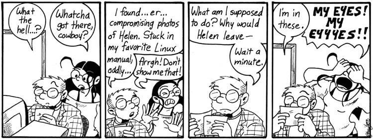 I wrote this one super early on. I was sitting on it for a couple of years at least. Dave’s expressions are supposed to mirror the Kubler-Ross stages of grief: denial, anger, bargaining, and depression. That said, I like his expression in the last panel best. He’s either upset about missing his passionate affair, or annoyed that Helen would even try to convince him that such a thing happened.