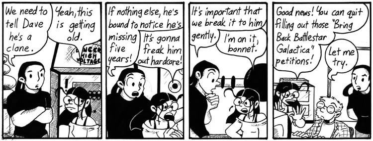This strip happened because at one point I’d written a “Battlestar Galactica” joke into a Narbonic strip, and by the time I got around to actually drawing it, the joke was ruined by the existence of the new “Battlestar Galactica” show. Thanks a lot, “Battlestar Galactica.”