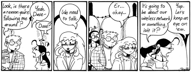 @Tetra: I think it’s more an effect of Clone Dave’s “mundane-ness” (or whatever Helen calls it; I don’t want to search through the old Narbonic archives for tomorrow’s strip for fear it might damage the continuum) that he no longer cares for science fiction-y things any more.