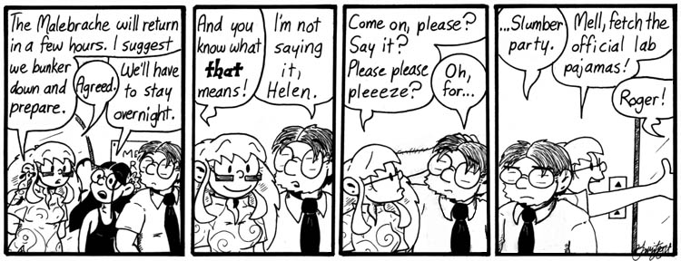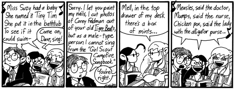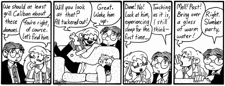 I wrote slumber-party strips early on and was delighted by the opportunity to work an actual slumber party into the strip. Also, Dave looks very cute in his shirt and tie.