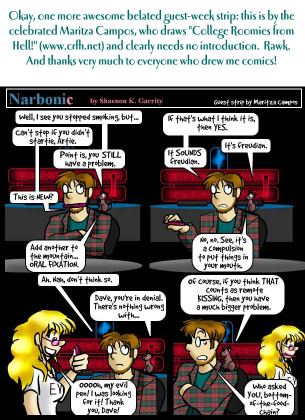 Maritza was originally going to draw this for the previous guest week, but she ran a little late, which was good because I was able to run it here. Good work filling another Sunday, me! Maritza put in a lot of attention to detail. At one point she emailed me to ask what color the characters’ eyes were, since I always just draw them as black dots in parentheses. For the record, Helen’s are blue, Dave’s are hazel, Mell’s are green, and Artie’s are, you know, whatever color gerbils’ eyes are. Black. They’re black when he’s human too.