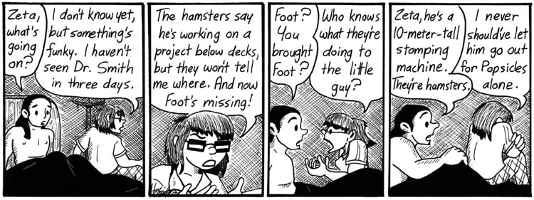 I like the idea that Zeta and Foot have been hanging out together all this time. This is my second favorite Narbonic sitcom idea, after, “Seth and Caliban share an apartment.”