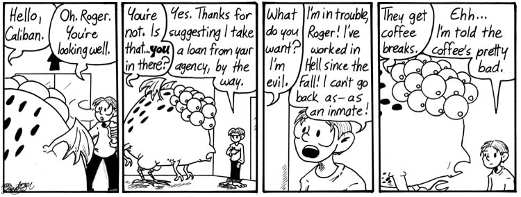 As I’ve mentioned before, Caliban is an old character I wrote into a lot of stories when I was younger, so he has a whole complicated backstory that doesn’t come up in Narbonic. For what it’s worth, he wasn’t one of the angels who rebelled with Lucifer. He was a conscientious objector, or possibly a big coward, who refused to fight on either side. According to some folk traditions, these angels were condemned to Hell along with the rebels. According to others, they were merely condemned to Earth, where they became the elves/Fair Folk/Fomorians/whatever. Caliban was cast into Hell, but he’s always had a closer affinity to the earthly plane than most angels or demons.