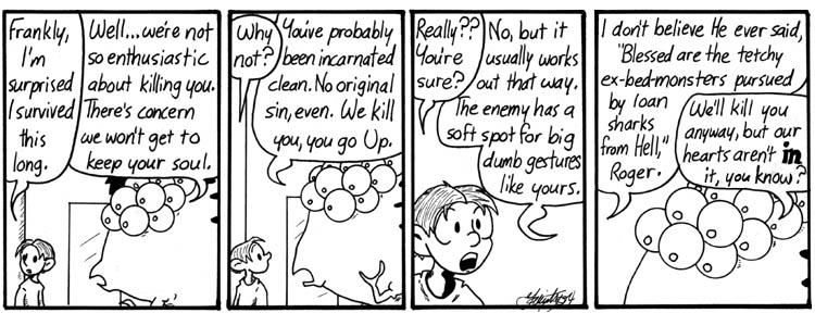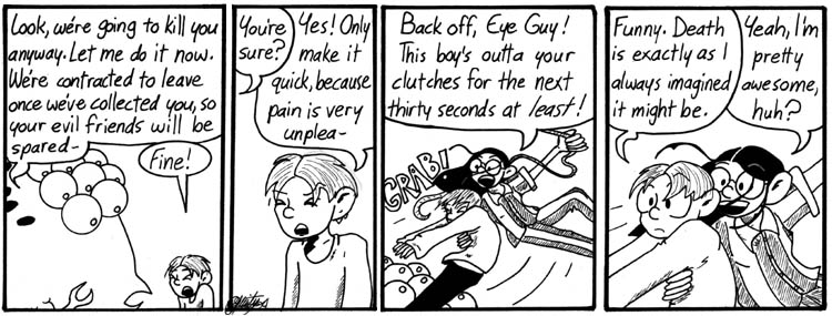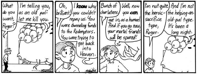 This isn’t an early addition to the Narbonisphere; this story line is following four years of odd, but oddly logical continuity. I assert that Helen’s Mom being the Bigger, Badder, ‘Bon is an entirely proper progression. Helen’s Mom zapping Dave was the rational conclusion of that plot. (“Nuh-uh, I had a Death Ray.”) As the main point-of-view character, Dave visiting the Afterlife instead of simply vanishing for a few months while dead for tax reasons made narritive sense.
