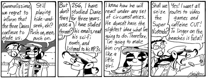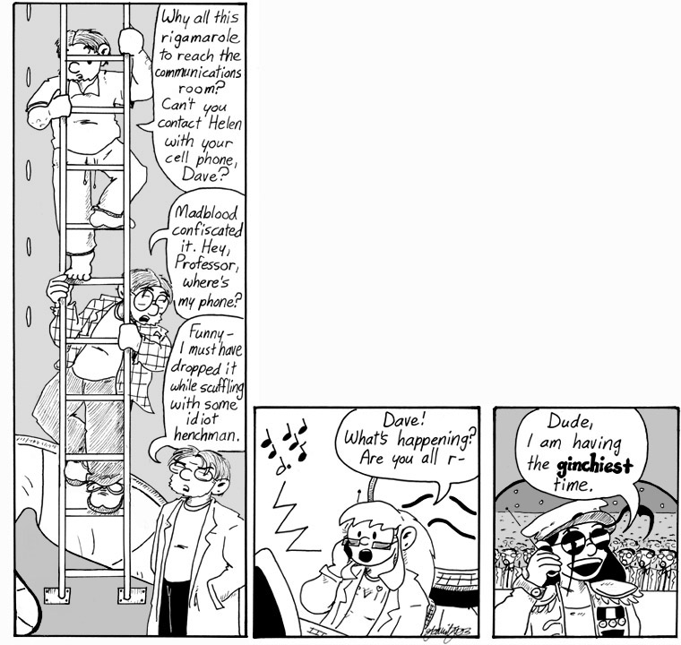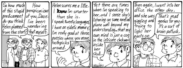 16. Wednesday:Oh, I always thought the first panel was a lie; after all, Helen is a mad genius, and if she were there, even as a Dave, there could be real trouble.