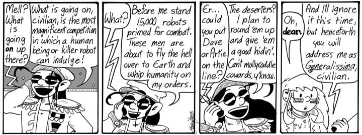 Helen’s last line here is pretty thoroughly autobiographical. I do like that line, but my favorite part of this strip is Mell’s casually insulting assessment of Dave in the first panel. Also, in the third panel, one robot is polishing her shoes while another offers her a platter of grenades, which is pretty good.