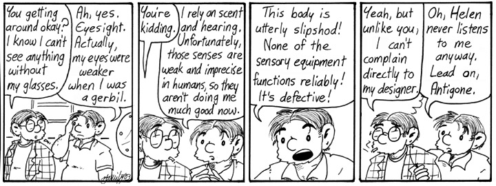 People were asking why Artie wasn’t more upset about being practically blind without Dave’s glasses, and this, along with the strip where he’s upset about lacking whiskers, is the answer. Artie is much less bothered by his poor (by human standards) eyesight than he is by his totally inadequate (by rodent standards) hearing and scent. (How does he smell? Terrible!) Rodents also navigate by touch and vibration, being built low to the ground, and an upright human body isn’t very useful for that either.