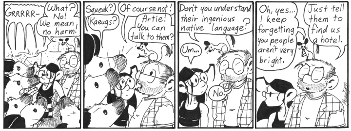 Today’s punchline is actually pretty funny. Artie entirely misses the most obvious reason for the human’s inability to comprehend ur-gerbil (they aren’t gerbils) and instead uses the most condescending conclusion (they aren’t superintelligent linguists). It’s the sort of joke that simply wouldn’t work if the ur-gerbils were the same species as the humans.