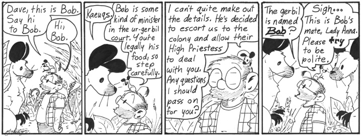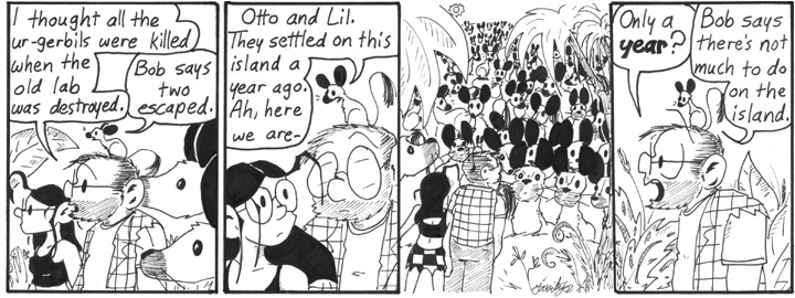 You know, the ur-gerbils must have some sort of intelligence if they’ve managed to make signs for hitchhiking and purchase boat tickets. If they had the power of speech as well … in today’s last panel, they would approach Dave, sniff him carefully from head to toe, and say …