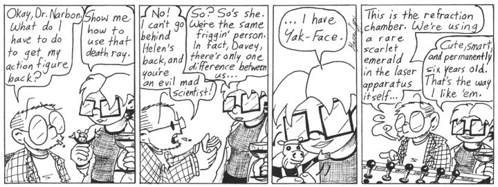 Monday’s Comic: Wait, how did Yak-Face end up back in Dr. N’s hand? Ah, foolish Dave! Had he the ability to resist the demon urge of tobacco (or, conversely, the ability to procure and light a cigarette one-handed), his precious