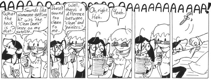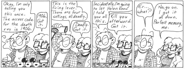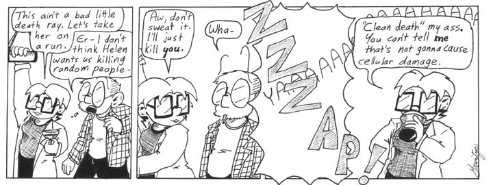 This is another strip I still like. I enjoy the timing of the conversation and the logic of Helen’s explanation. (You can tell it’s a clean death because Dave’s tissue is apparently totally undamaged, albeit decaying, when he gets resurrected later on. But not painless. That would be silly.) I also managed to draw five panels without making them painfully cramped.