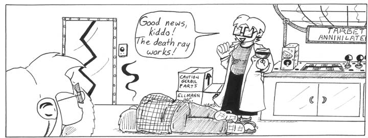One problem: in the first panel, Mell indicates that the scream is coming from stage left, but in the last panel she and Helen run off stage right. I should have had them run left in the last panel, even though it would’ve slowed down the eye and generally made the flow of action a little awkward. Or maybe just drawn the test tube suspended in midair, one of my favorite visual effects stolen from Chuck Jones cartoons.