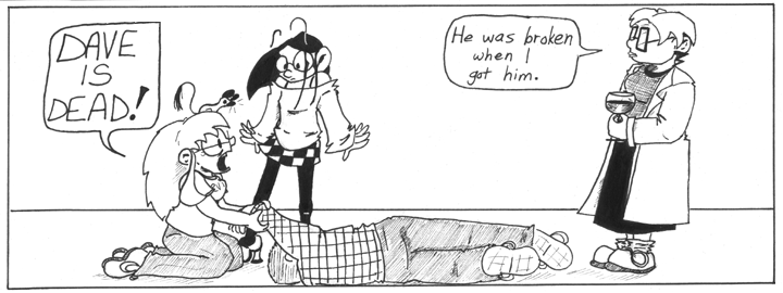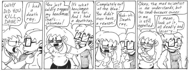 Question. I don’t ever remember the death ray being broken, yet in strips yet to come Dave is seen fixing it. Helen even talks to him about it. How did it break? Did it commit suicide after realizing what it had done? To me that seems the most logical explanation, recalling how much computers love Dave in “Professor Madblood and the Doppleganger Gambit”