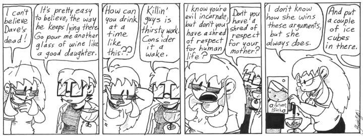 I really think this strip represents one of Dr. Narbon’s shining moments. Comforting Helen over the death of the man she herself killed, recommending that Helen try kicking him…she’s a class act all over, that lady. My crude early art aside, the facial expressions are pretty good in this strip, too. It was a good choice to have Helen look bewildered in the last panel, rather than disgusted or angry. Helen’s perspective isn’t quite as warped as her mother’s, but it should still be a little abnormal. She’s only particularly upset in the first place because she liked Dave.