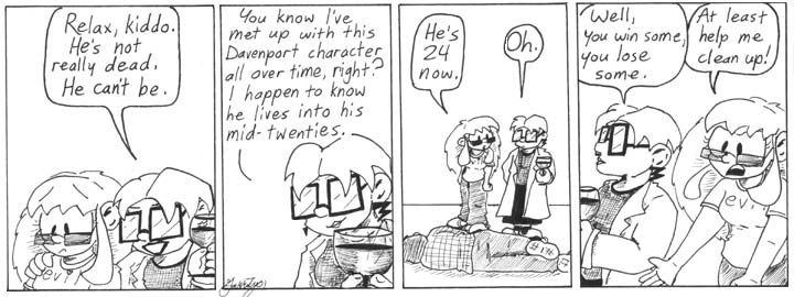 Dave was 23 when the strip started, so he’s had a birthday sometime since July 31, 2000. I tried to remember to turn the characters’ ages over each year on my birthday, May 4. At this point, Dave is 24, Helen is 27, Mell is 19, and Artie is about six months old.