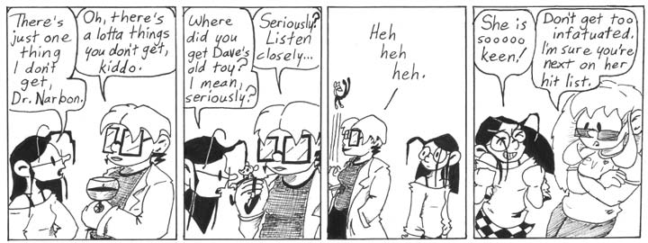 Here we segue into a new storyline, “Dave’s Dead, Dave.” The title is, of course, a play on the famous line from 2001, a movie that would come up again much later in Narbonic. As I’ve mentioned before, “Smart Gerbils,” “Dr. Narbon,” and “Dave’s Dead, Dave” all flow into each other; if you take them together as a single storyline, it’s six months long, pretty long but still not the longest Narbonic storyline.