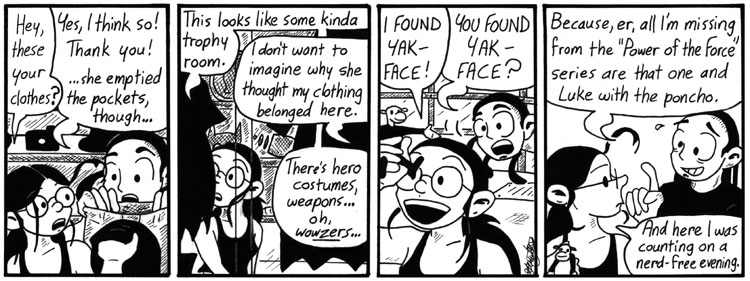 Dr. Narbon took Dave’s Yak-Face action figure with her after using it to get the death-ray codes from Dave, whom she then killed with the death ray, way back when. I guess she keeps it around in case it turns out to be handy again. Sometimes this strip gets complicated.