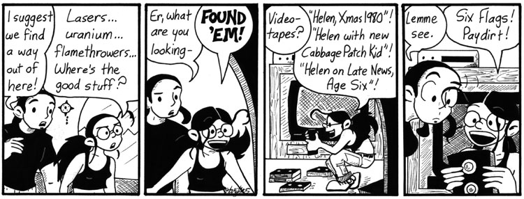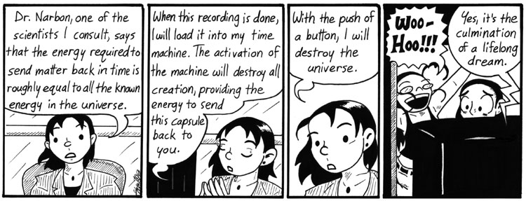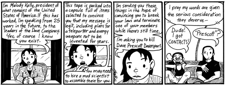 Okay, this plot dump is necessary but not very funny, which is why I crammed a TON OF DIALOGUE into one strip to get it all over with. I’m sorry. So, basically, here’s what happened: Future Mell sent the tape back to the Dave Conspiracy in the year 2000, along with some future mad-tech designed by Dave. The Dave Conspiracy took the message seriously and hired Helen’s mom to build the tech and assassinate Dave. They got Dr. Narbon’s name from the video; they just recruited the wrong Dr. Narbon.