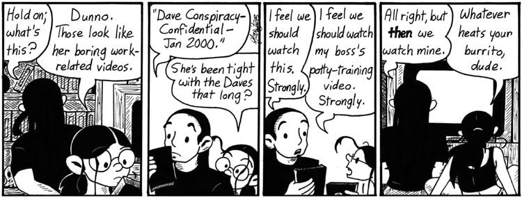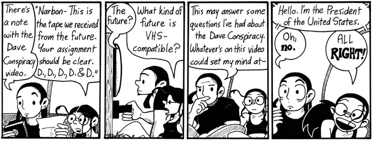 “What kind of future is VHS-compatible?” is a pretty good line; it’s kind of the “Why does God need a starship” of Narbonic. But the best part of this strip is the Dave Conspiracy’s Circle of Five all signing their initials to the note.