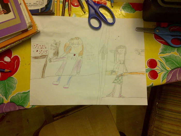 This is part of a story in which super-intelligent gerbils are either growing or shrinking — I am not entirely sure — so I have told her to write more of it so that it becomes clearer. She is writing it as Artie’s diary entries. Janet’s Artie has very bad spelling but a reasonably good cursive hand. For a gerbil. In the initial picture, Artie is apparently explaining something about the growing-or-shrinking supersmart gerbils to Helen (each of those little magenta dots is a gerbil), and Mel wants to shoot them, and Dave wants to have a cigarette. I think she has got the characterization down, really.