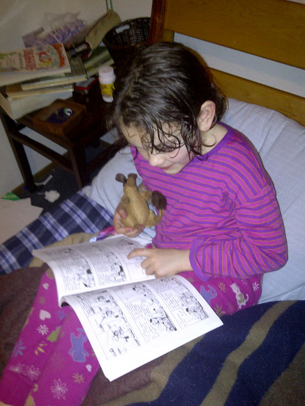 And today’s installment is worth the wait, because I have the greatest photo to add. Last weekend, at the Stumptown Comics Fest, I finally met Sara Palmer and Janet, who is now older and amazingly well-read, in person. I gave Janet a plush gerbil, which she showed off to everyone at the convention, as most of the other exhibitors can attest. Afterwards, Sara sent me this photo: