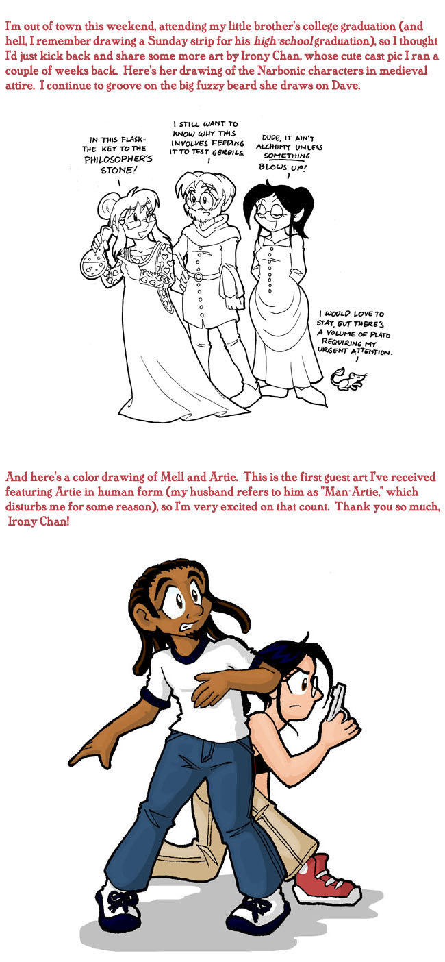 3. I love Medieval Mel’s line-“Dude, it ain’t alchamey unless something blows up!” The drawings are adorable.Hee, and Human Artie’s ‘oh, crap!!!” freaked out expression while behind him Mel has her ‘A hunting we shall go, yo” face on.